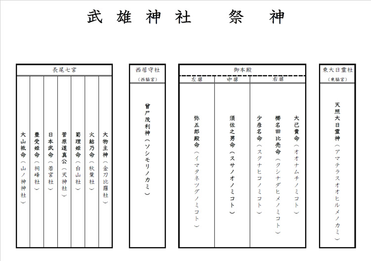 鎮座地の町名である「武豊」とは、明治11年に、旧長尾村の当社“武”雄神社と隣の旧大足村の“豊”石神社の両氏神の頭文字を取ったものであります。